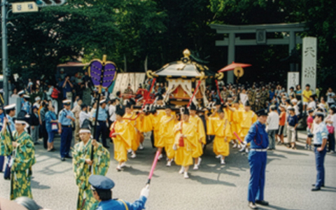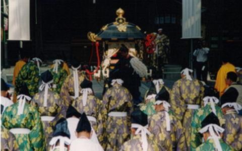 ご祭神の分霊を鳳輦(ほうれん)にお移し市内を巡る5年に1度の式年大祭の華とも いえる荘厳な行列。 氏子が平安時代の装束にて随従する。