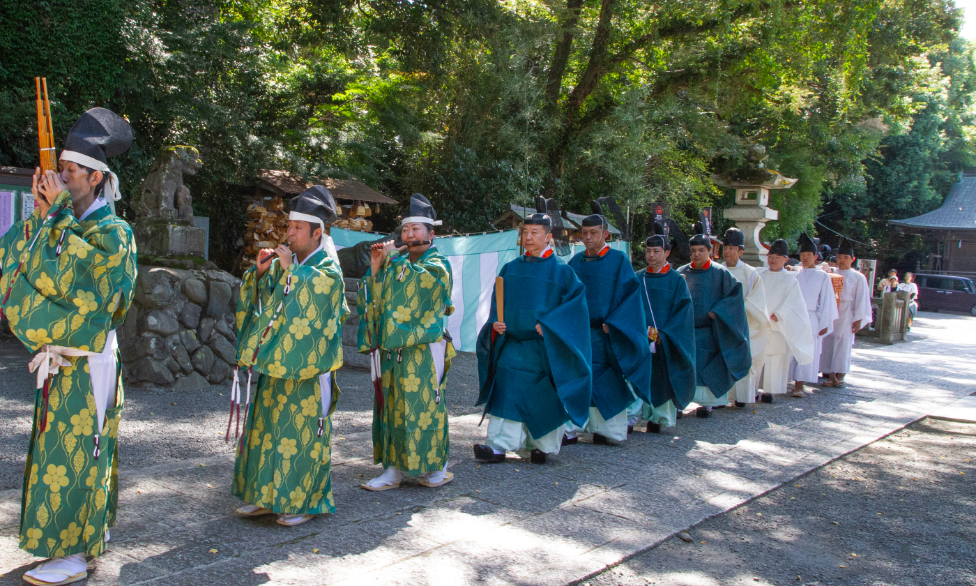 ご祭神の分霊を鳳輦(ほうれん)にお移し市内を巡る5年に1度の式年大祭の華とも いえる荘厳な行列。 氏子が平安時代の装束にて随従する。