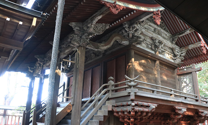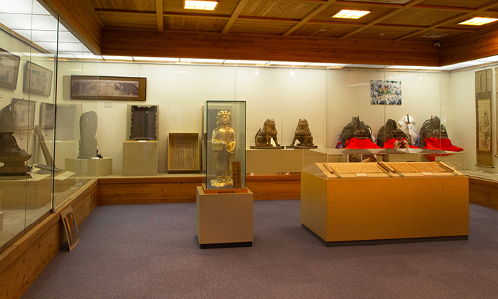 宝物殿は社務所の2階にございます。日曜と祝日の11:00から15:00まで無料でご参観いただけます。