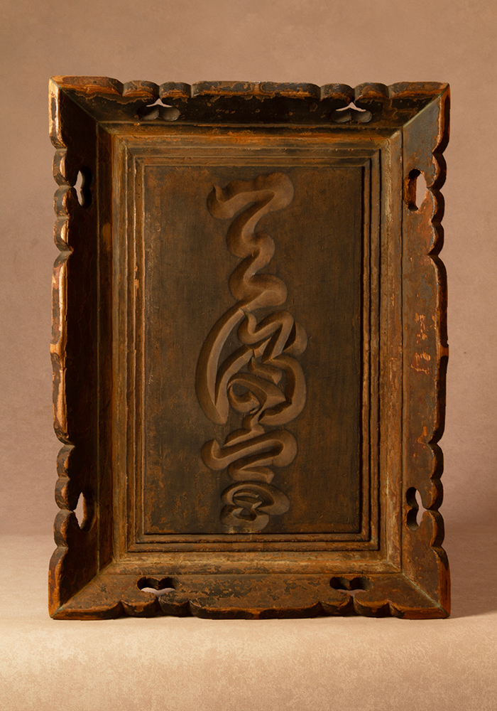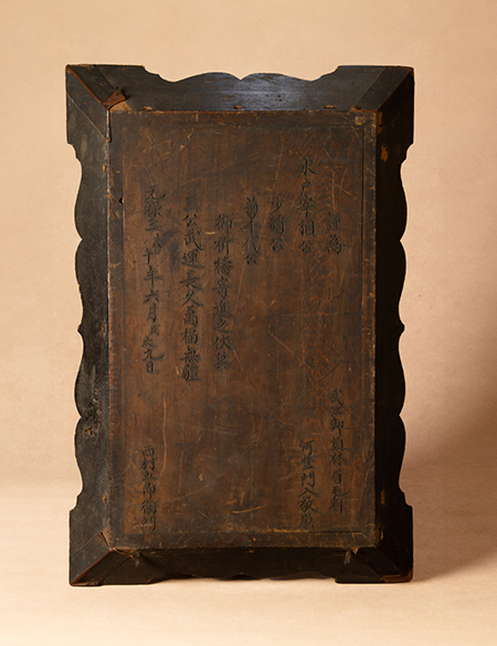 縦68.2センチメートル、横50.0センチメートル、檜材で、長方形の額の四辺は、曲線にえぐり込み、猪目透かしを施し、額は四材を 矧ぎ合わせ、全体に布着せをした上に、黒漆が塗られています。額面には周囲を三重の條線で囲い、縦に「天満宮」と草書体で揮亳した文字が彫り込まれています。 額板の裏には、「建治元年乙亥六月廿六日乙丑書之」、「正三位藤原朝臣経朝」の刻銘があり、建治元年(1275)藤原経朝の筆によることがわかります。