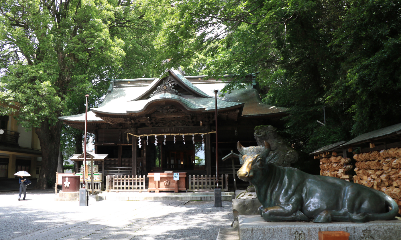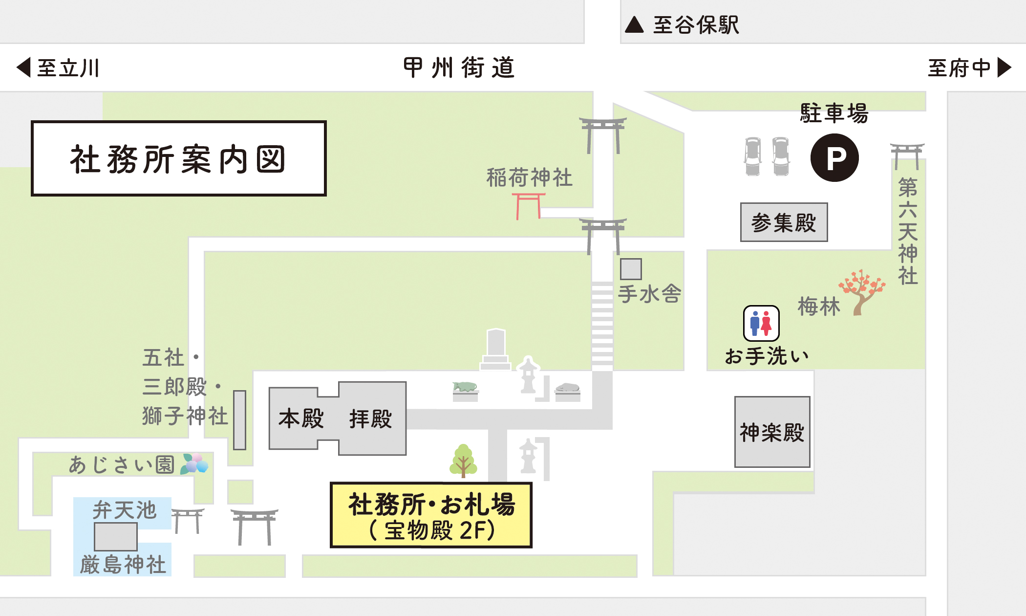 谷保天満宮の社叢は東京都指定の天然記念物に指定されております。社叢とは、いわゆる鎮守の森のことで、参拝者はその鎮守の森の厳かな雰囲気の中、静かな心持ちで参道を進みます。17世紀ころまでの甲州街道では谷保地区周辺は立川段丘の下を通っていました。そのため社殿は街道に面し、南向きに建てられています。