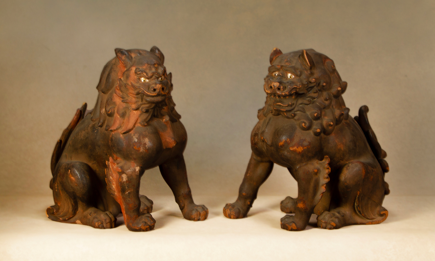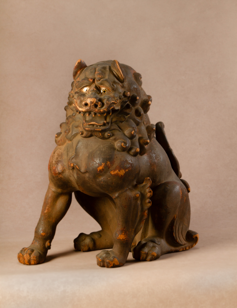 両像ともお互いに拝者側(内側)に体をやや捻って頭部を向け、内側の前肢を手前に引き、もう一方の前肢を前方に踏み出し、拝者側に顔を向ける姿勢をとり、 動きのある動物らしい現実感ある写実表現のなかにも穏やかな作風を示し、獅子狛犬の伝統的な技法をみせる鎌倉時代を代表する作例として貴重なものです。