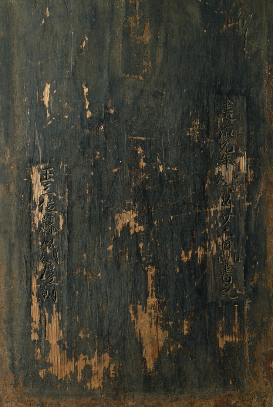 縦68.2センチメートル、横50.0センチメートル、檜材で、長方形の額の四辺は、曲線にえぐり込み、猪目透かしを施し、額は四材を 矧ぎ合わせ、全体に布着せをした上に、黒漆が塗られています。額面には周囲を三重の條線で囲い、縦に「天満宮」と草書体で揮亳した文字が彫り込まれています。 額板の裏には、「建治元年乙亥六月廿六日乙丑書之」、「正三位藤原朝臣経朝」の刻銘があり、建治元年(1275)藤原経朝の筆によることがわかります。